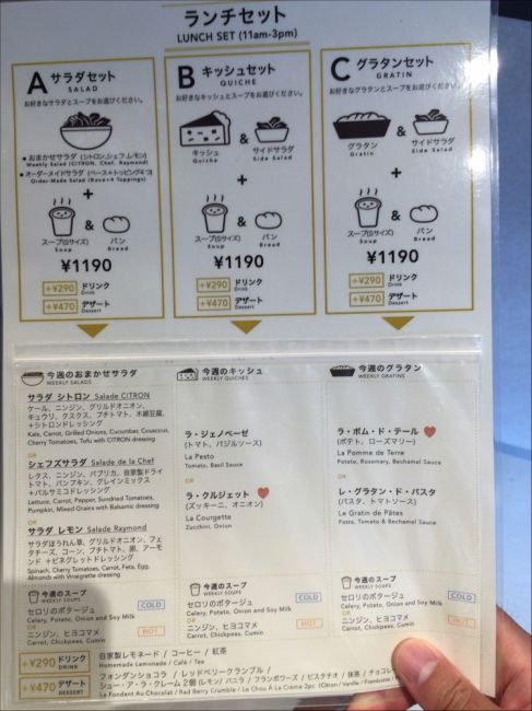 キッシュセット シトロン Non 2015年08月23日 19:43 外で動きすぎて、ちょっと食欲があまりなかったので、今日のランチは外苑前に今年7月にオープンしたサラダを売りにしてるシトロン (CITRON)へ。 キッシュセットの中身は、キッシュ、サラダ、スープ、パン。 今日のキッシュの中から、ラ・ジェノベーゼ(トマトとバシル)を選択。 スープは、ニンジンとひよこ豆のスープ。 ドリンクは、+290円。 疲れた体にはレモネード♪ 今日は、DOGS' DAYだったらしく、可愛い犬を連れたお客さんが多かった(^^)