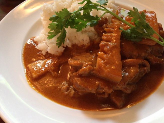 若鶏と竹の子のレッドカレー ウラエビス Non 2015年08月26日 01:13 ランチミーティングをしたかったので、ウラエビスでカフェランチ。 ランチメニューの中に日替わりの煮込みメニューがあり、本日は若鶏と竹の子のレッドカレー。 鶏のもも肉が丸々入ってて、ボリューム満点。 辛さはほとんどなく、シチューに近いかも。 クリーミーでコクのあるスープで煮込んだ鶏肉は、ご飯をかき込ませる。