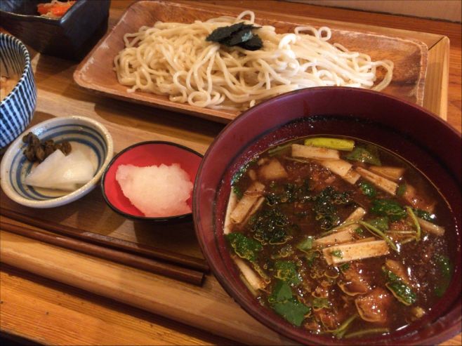 Non 2017年01月26日 00:28 恵比寿駅東口から徒歩7〜8分の大通りから1本奥に入った通り沿いにあるおしゃれ居酒屋「ebisu 蔵(クラ)」。 ランチはうどんメニューが並ぶ中、豚のつけ地粉うどんを注文。 つけ汁には角切りにした煮...