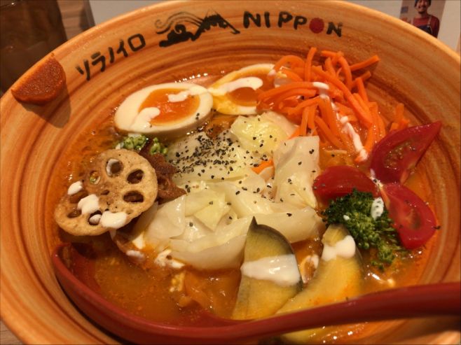Non 2017年05月19日 21:38 東京駅構内の東京ラーメンストリートでヘルシーラーメンとして人気の「ソラノイロ・NIPPON」。 ベジタリアンでも食べられる人気メニューのベジソバは、麺、スープ、具のすべてに野菜を使用していて、見た目...