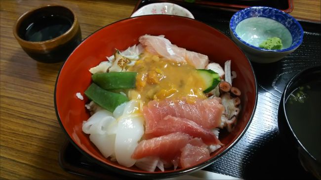 うに、いか、たこ、貝、刺身。時期によって貝と刺身が変わるのかな。緑のやつは、分からぬです。