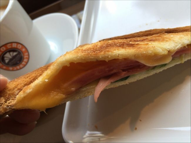 Non 2015年06月01日 09:30 ホットサンドがあることに気づきサンマルクで朝食。 焼きたてのタイミングならベストなんだけど、ちょっと温かいくらい。 モーニングセットでカフェラテ(+210円)と一緒に。