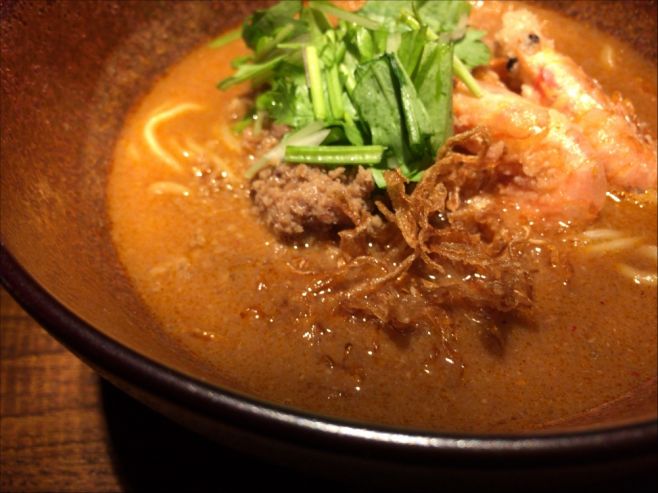 Non 2015年08月01日 22:43 海老料理専門店のシュリンプガーデンにて、海老づくしの料理を堪能した後に、〆の海老ラーメン。 細麺に濃厚スープがたっぷり絡んで、海老の風味がこれでもかと広がる。